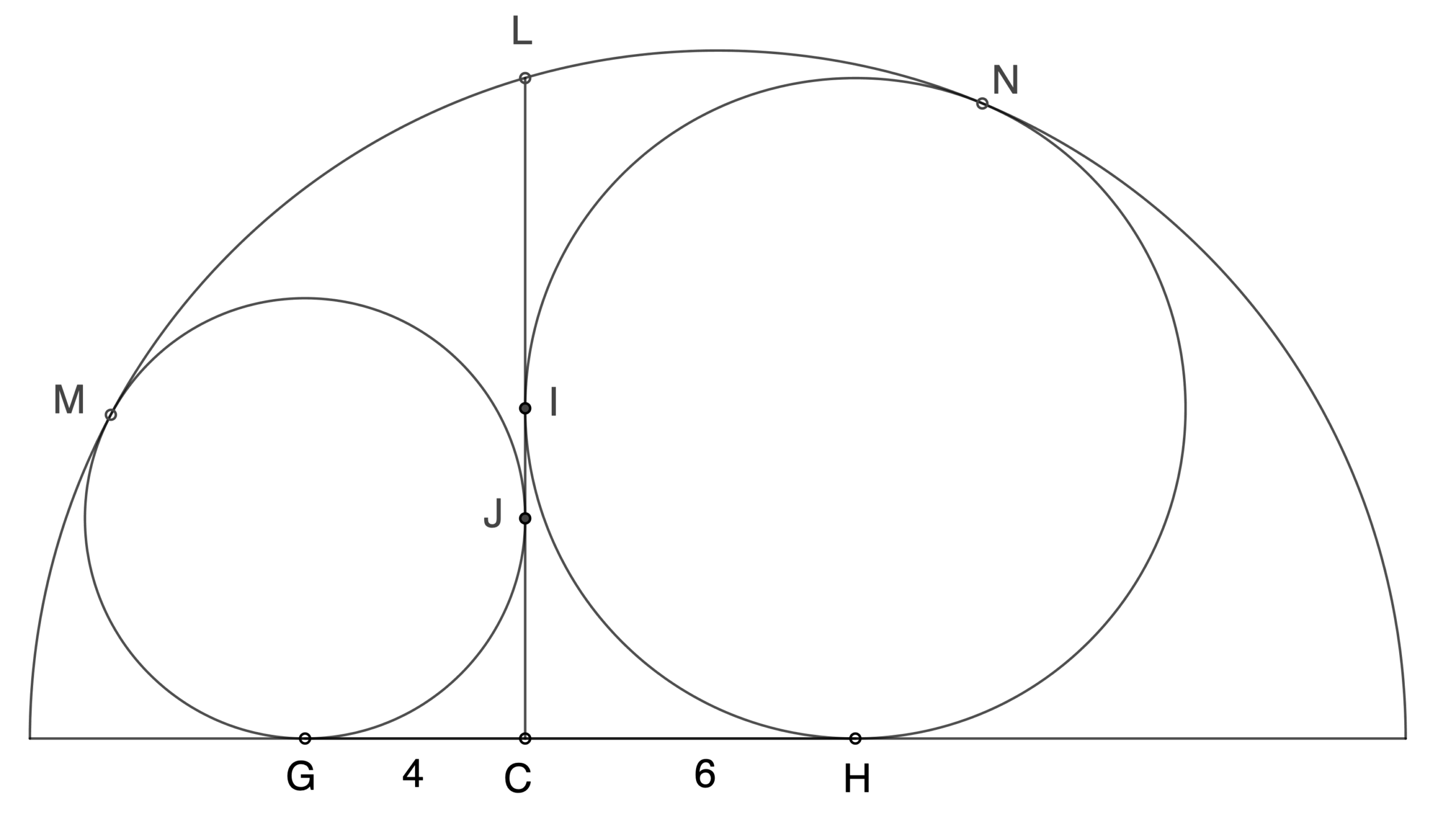 Les cercles sont tangents au segment $[LC]$ respectivement en $J$ et $I$, tangents au diamètre du demi-cercle respectivement en $G$ et $H$, tangents au demi-cercle respectivement en $M$ et $N$.