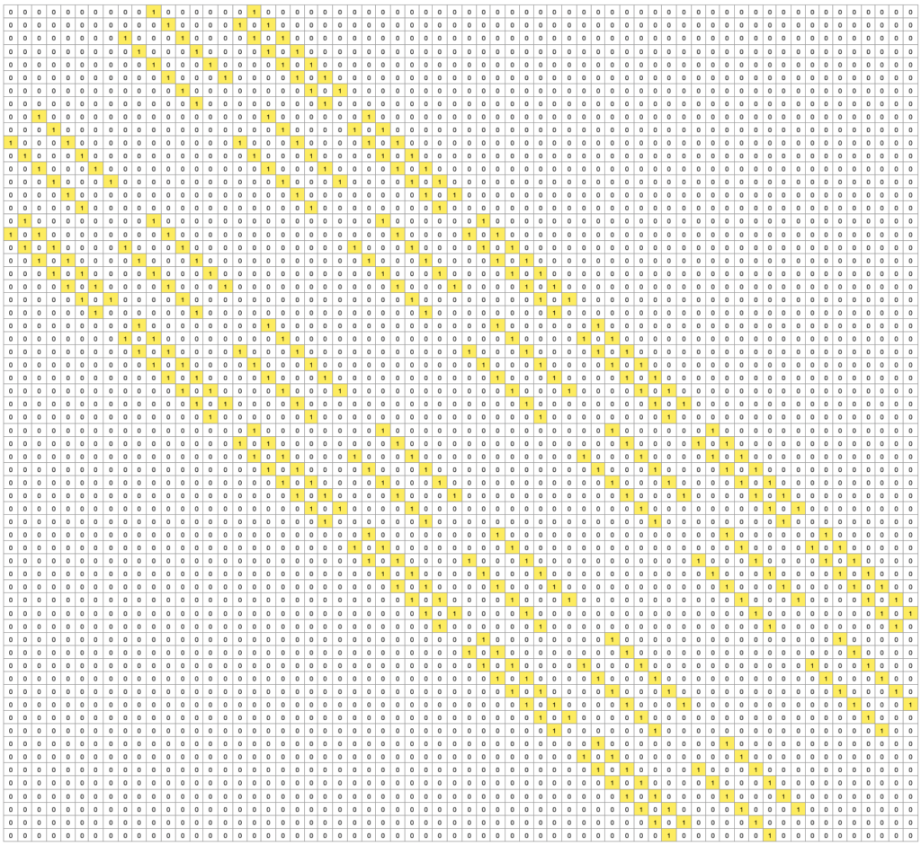 Je prends rapidement conscience de symétries que j’exploite pour terminer le remplissage rapidement et j’obtiens la matrice ci-contre, dans laquelle les 1 sont surlignés en jaune.